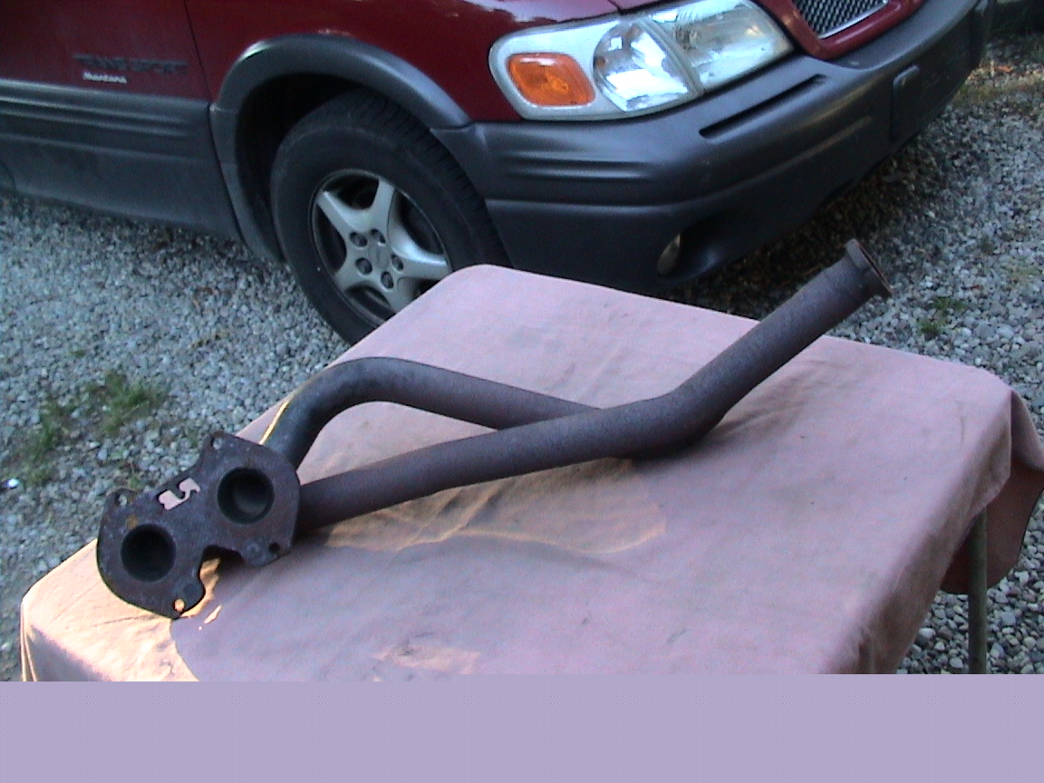 Second is of unknown origin. Good quality though, and resembles a RB header. 2 into 1 with a 2.875 outlet, 3 bolt flange. Has some sort of coating on it, looks like it has been run at least once, but like new condition.