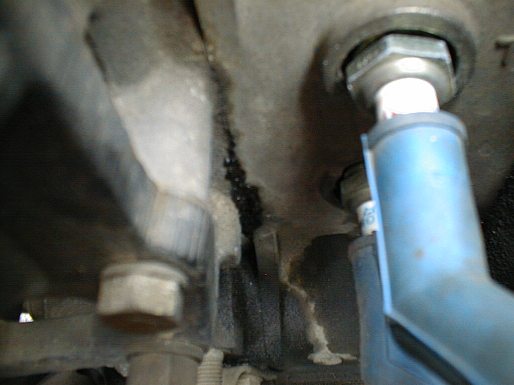Thanks for the info. The leak is in the front closest to the radiator. I attached a picture. Also, I just had my local Mazda shop check out the car and there was no mention of a problem. They said the compression test was normal #1 9.4 and #2 9.8.?