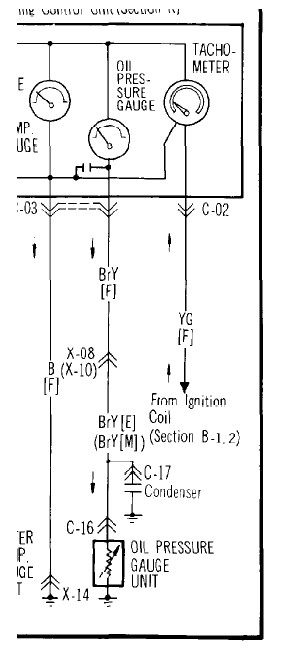 So I went to the Dealer to get this condenser. Dealer tells me he can't find it so I told that I will be back. I spent alll day looking threw the micro finch cd and only found the ignition condensors and not the oil gauge/ switch condensor. I also had this concern when I looked it up in a wiring diagram look below, remeber I have a 1984 GSL 12a.
