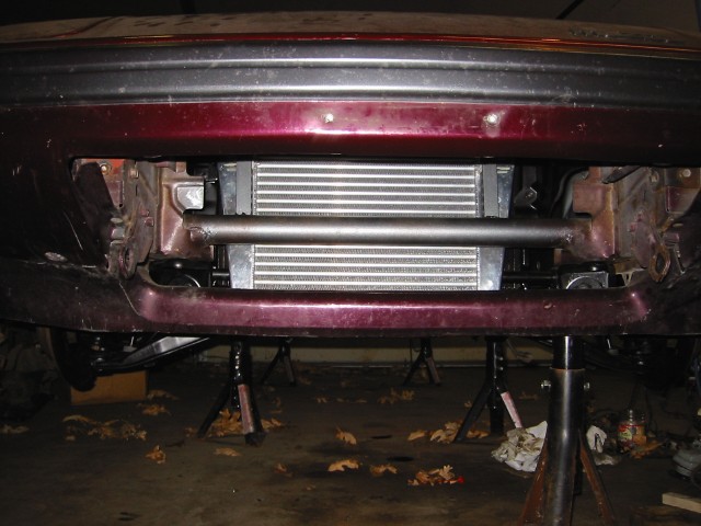 It sure hangs down a bit too much though. You'll probably hit it on something down the line and ruin your day. I'd hate to hear a "I busted the bottom of my intercooler off today" thread. Why did you use those big red straps to hold it in there? They block a lot of airflow. Could you mount it in there at more of a angle so it woulden't be so low to the ground? Anyways, it should keep the air cool either way