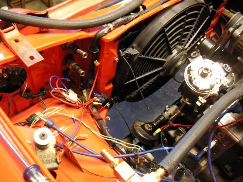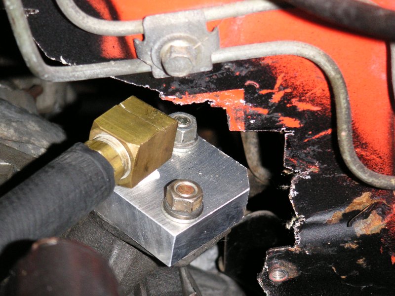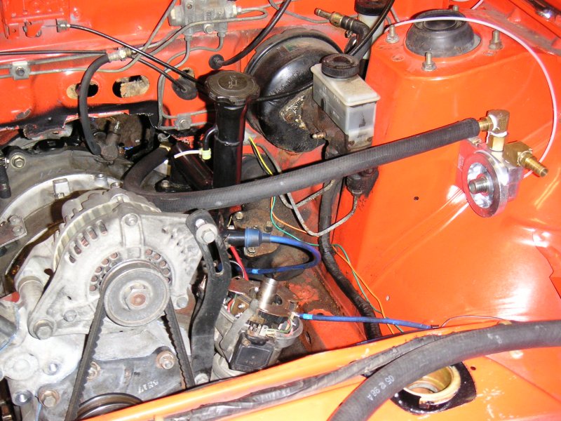 You can see the two oil cooler fittings (barbed ends) have been gutted from the stock lines are are waiting for aftermarket lines. Same with down at the front cover.