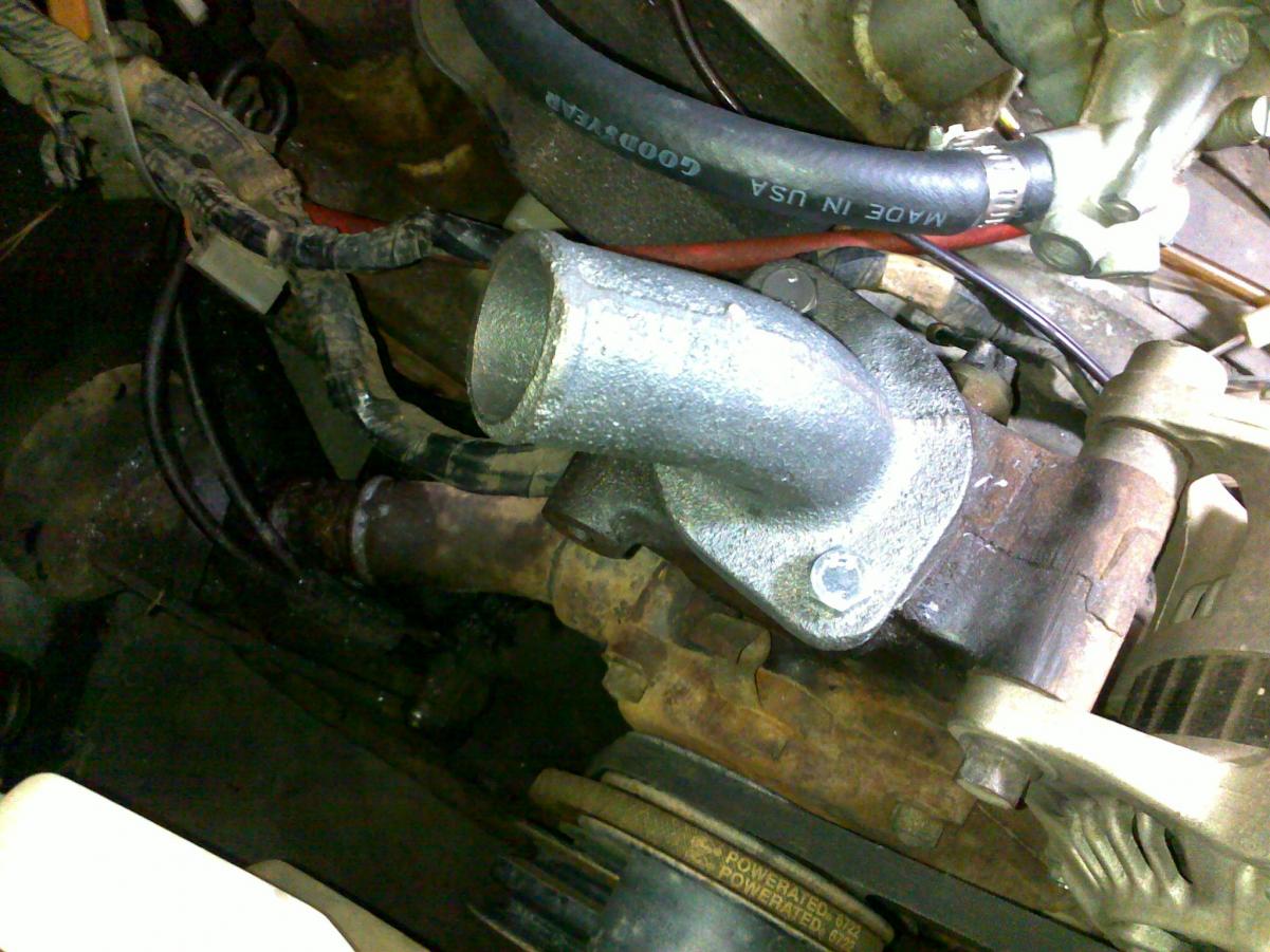 New thermostat housing mounted as just to see if it fits. I still need to clean up the block mounting surface a bit and most likely use some silicone to help it seal. It's a bit pitted from years of leaking...