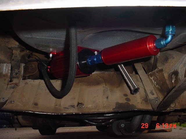 RCI 16 gallon drag race fuel cell (Mazda tank and fuel system removed completely), Aeromotive A1000 fuel pump, System1 8"-100 micron billet filter, -10 feed line, -8 return line into a Mallory race pressure regulator (part # 4309) with vacuum actuator for more fuel under boost.