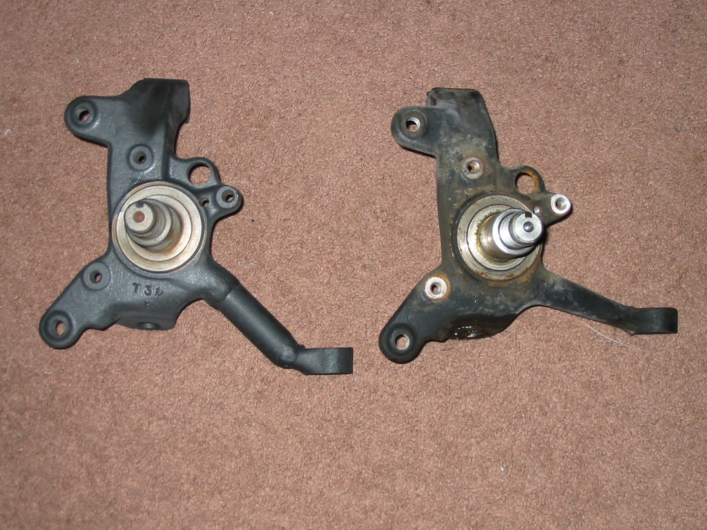 The Pettit subframe lowers the rack about 3/4". as you can see the spindles are modified to eliminate bump steer by lowering the arm the same ammount. The spindles also requite 17" or lager rims, due to the lower positioning of the tie-rod mount.