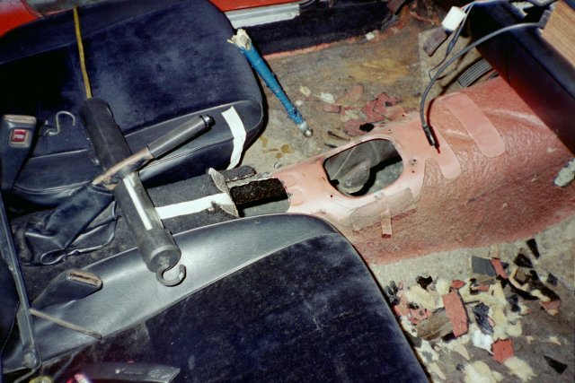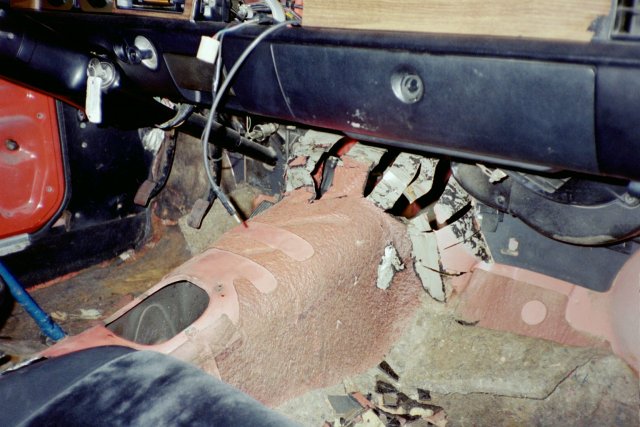 A shot from the inside after I did some more cutting to the firewall. Now that I think about it, it may have been a better idea to have simply cut out the whole bloody thing and started over. But then again, all this will need is several little patches and then it's done. I'll see how hard it is to weld on that stuff when the welder gets here.