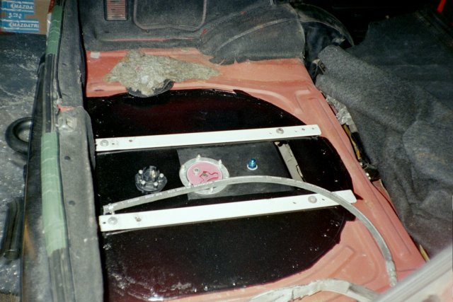 Here's the fuel cell installed in the spare tire well. Well actually, the whole thing was comepletely missing when I got the car. Not to mention the sheet metal that was welded in there was cut out to fit the sump facing forward for chris'sakes! That's just wrong! I took the anitiative (sp?) and installed it the correct direction and below the sheet metal. That's basically what took me so long to install it if you recall my earlier posts in this thread.