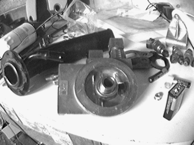 Here is the oil fitting. To the right, you can see the 8.8 bolt I used for the front lifting hook. I figured 8.8 would be stronger than grade 6. You can also see the FB dizzy with a points cap and the trailing casting chopped off. It's got a white nylon cap in the hole. The Leading casting is still there, and has a rubber cap in it.