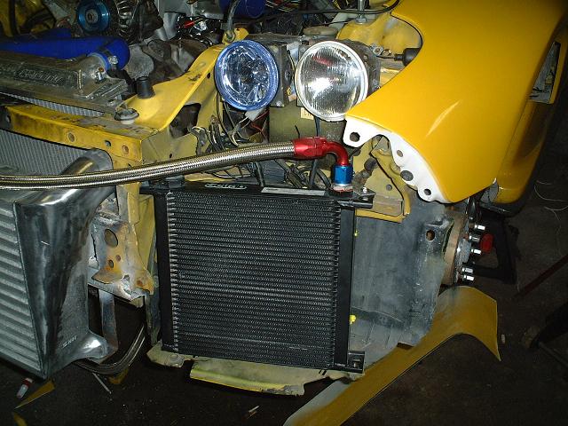 34 row Setrab oil cooler mounted with a 10" flexlite fan on the back of it.