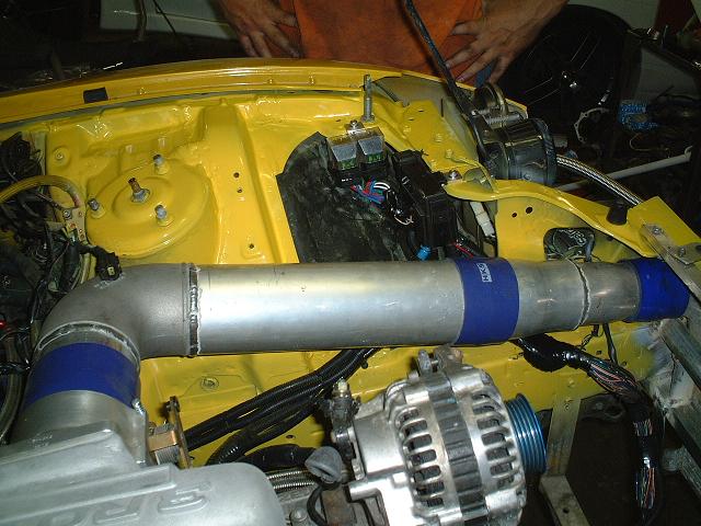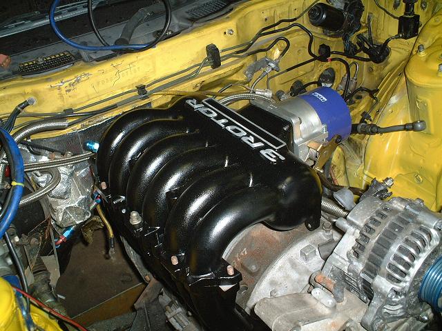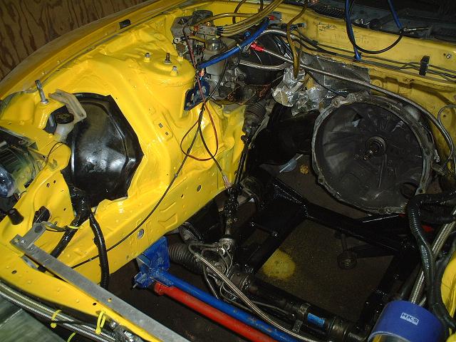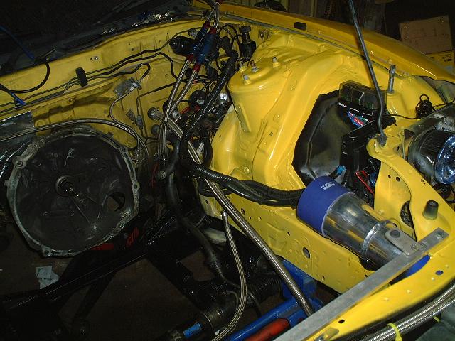 Right now I'm starting to come to a momentary stand still while waiting on my LTX12 to get here and I'm still waiting on a order from summit racing as well, So I've been mostly tearing up wiring harnesses and ripping out all the no longer need wires and consolidating stuff. I.e. I ripped all the ABS **** out and then used that fuse to run other stuff so I could then remove the front relay box and the relay fuse box on the strut pillar. And I've repainted and cleaned up most of the engine bay with the exception of the left back corner... I also went ahead and painted the intake manifold and started polishing up some of the aluminum. Any way here are some more pics.