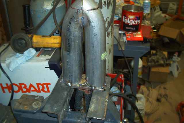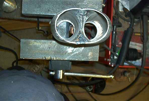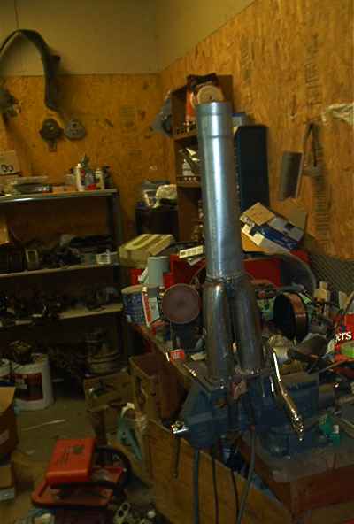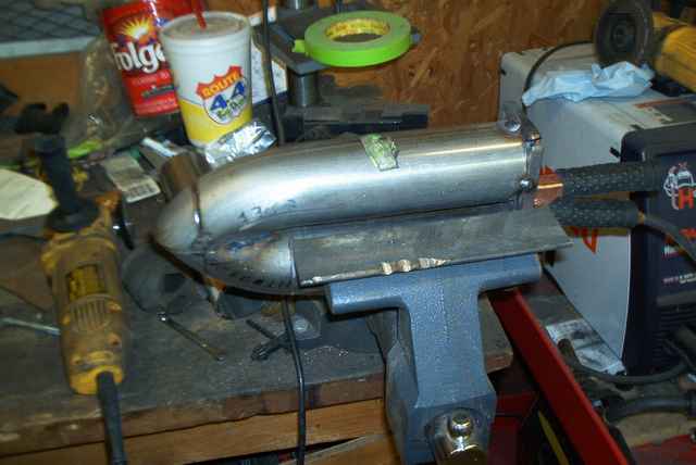 with the collector pipe. It is oval into the 3" inlet for the SPINTECH muffler. Yep... I hear ya'll scraming:"ITS TOO BIG!!!!!". I know I'm experimenting. IF it sux, the components will work on the turboII.