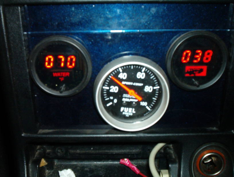 Lil interior pic of some of the guages...yea, for anybody going big, GET AN FPR GUAGE, for the love of god,lol. We have recently noticed that at anything over 12psi the FP drops 10psi and keeps falling...def time for a bigger fuel pump...