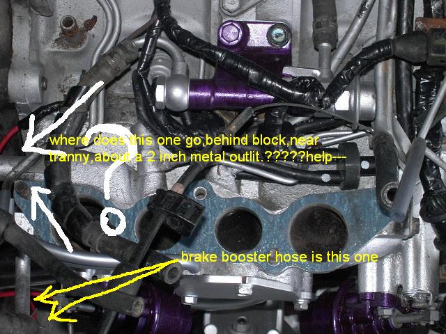 Thats not the one,your like an inch from the one I am talking about,brake booster hose connects to the long *** one coming off motor,but whats the one on the back of the motor,right next to it???????????????pretty big outlet