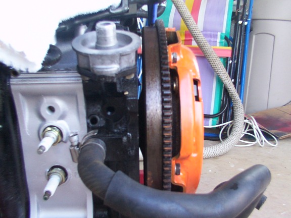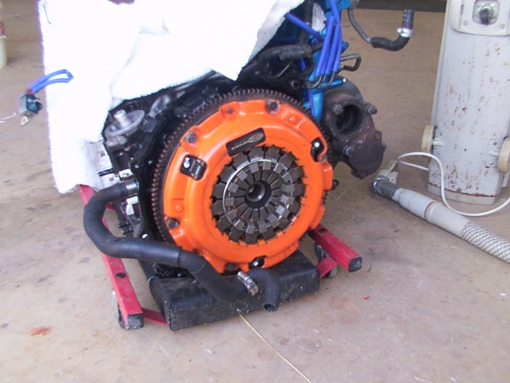 ) a nice CF DF clutch...threw that on, tightened everything down, and slid the block back into the corner of the garage until Sunday when I will be installing the oil pan, motor mounts, etc and HOPEFULLY dropping the lil bitch into the car :twisted: