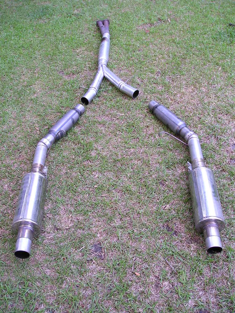 Heres the pics of my last exhaust. Starting at the engine side and moving backwards, the mufflers are an 18" long dynomax race bullet muffler, 2 moroso spiral flow mufflers, and 2 magnaflow 6" round polished SS mufflers. All mufflers are 3" in/out, the the pipe is single 3" to dual 3".