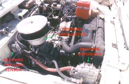 You can't use propane in a carb. Carbs have floats in them that "meter" or control the amount of fuel that is in them. These floats are sitting in LIQUID gasoline all the time. Liquid propane is extremely cold and needs to be compressed in order to be liquid (i think). It can run on a fuel injection system because of the high pressure (30-35psi) that they run at. Most carbs (weber,dellorto,holley) use about 1.8-10 psi of fuel pressure, the propane will "vapor lock" the carb and push the float bowl all the way up on its needle and seat and shut fuel off.