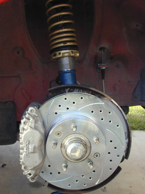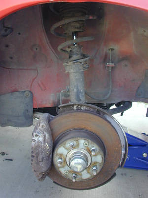 Started working on the suspension and brakes yesterday. I got the passenger sider front done. Installed MazdaSpeed coilover, Brembo rotor, MazdaTrix SS brake line, and a rebuilt and cleaned caliper.