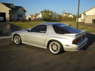 in progress, Lots of Aero, and soon to be ~500 rwhp. 335 Kumho road race tires to make it stick. This car started life as midnight racer, making~530 hp, and sporting the stock bronze color, and no wing, the car was quite the sleeper. When I purchased it, the owner had switched the car to a .60/.81 P trim TO4S. The turbo gives instantaneous boost, spinning 235-40-17 R compound tires all the way through first an second gears. That's nice for autocross, but I plan to rad race this car in the NASA Super unlimited class. With that in mind we will be switching to a T66 .81 Q trim in the quest for ~500rwhp with good response. If that comes up short we will use a Garrett GT40R Ball bearing 67mm turbo in a .94ar. The tire wheel combo has been my biggest dilema, I want to run 335s out back and 315s up front, but the only two R compounds available are the Kumho Ecsta 700(known for chunking out), and the Hoosiers(expensive, and don't last)My saving grace may be the viper club, as they run Michelin Pilot slicks in these sizes. I am working on getting a connection for scrubs, so my budget survives the tire costs. The Body is a mix of a Tripoint flare kit, a Rotary Extreme GTC nose, a custom reverse cowl hood(copied from the 3rd gen Mazdaspeed piece), and a BIG wing. I'd like to run the RE wing, but at ~1200.00 I will have to find something else. I may also create a functional roof scoop utilizing the stock TII hood scoop(we shall see). Anyway the goal is a road racing beast able to hang with just about any thing out there(in the amatuer ranks) I will keep the updates coming, as I finish them. Later for now Carl Byck 707-696-2705