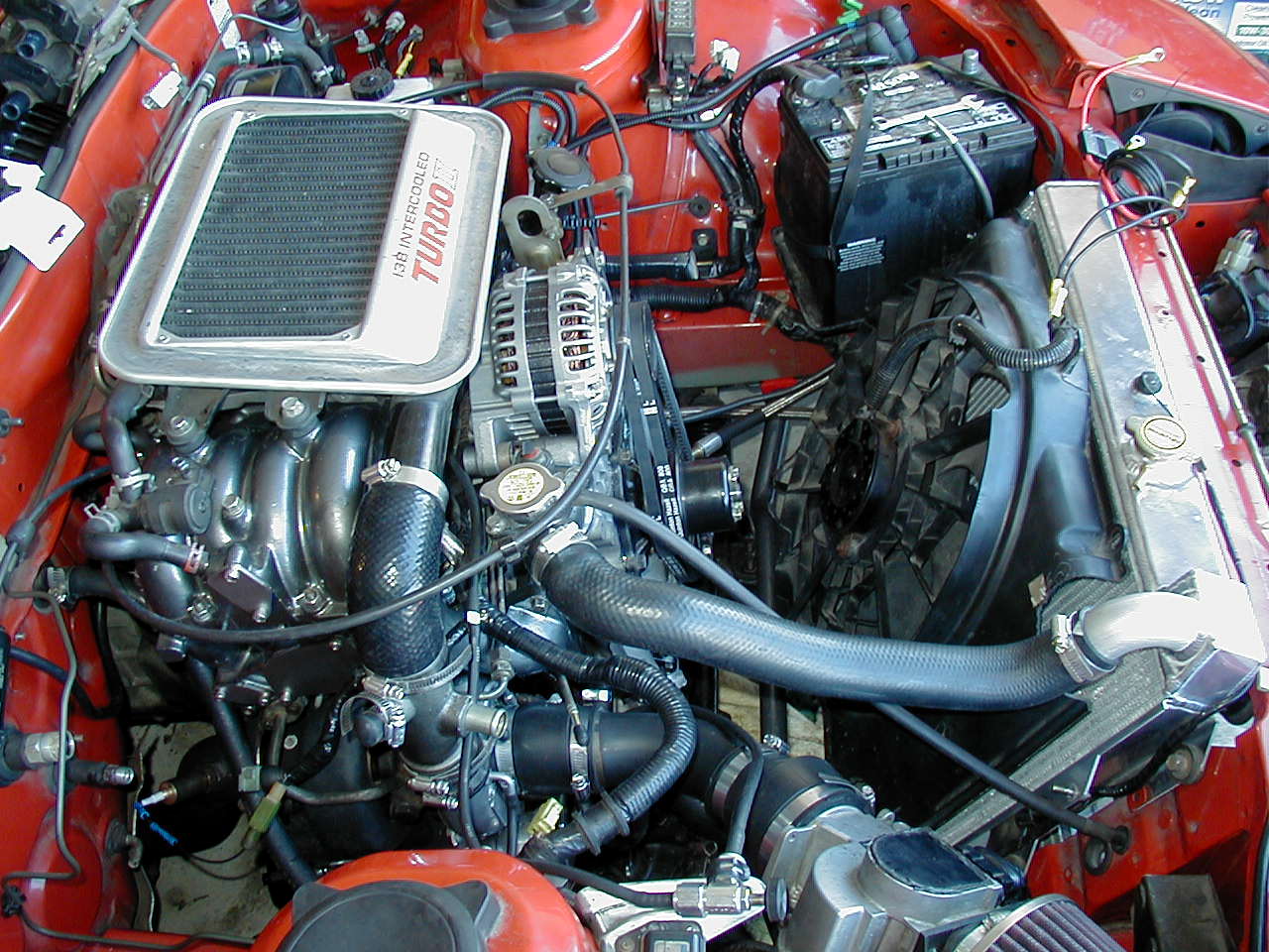 So Sunday I went over to ZenRXSeven's house to check on the progress of his (formerly mine) TII and to just hang out. I took some pics (which I will post when I get home aafter classes) of his sweet new Pineapple motor (it's a large streetport with oil and coolant mods) all installed with the powdercoated manifolds, polished and painted turbo, Fluidyne rad, etc. We wired up the Taurus 3.8 2-speed e-fan, and after one false start (my bad), the fan fired up without a problem. It flows insane amounts of air (something on the order of 3000cfm)!!! I completely forgot to take pics of his suspension while I was there, but the whole setup is super slick...KYB AGX shocks, Eibach springs, all new solid urethane bushings, new (thicker) stabilizer bars...oh so sweet...It's so stiff that even on the softest setting, the car barely moved when I pushed down hard on the corners. Anyway, I will post a couple motor pics this afternoon.