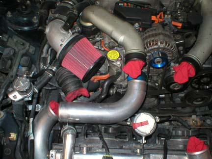 here is a picture, excuse the dirty engine bay. I still have one of the APEXi filters on my car, because the shop that carried the filters only had 1 k&N.. lol and i haven't yet gone back up there to get another. Essentially, i took the filter i bought to Home Depot and looked around in the plumbing section. There aren't any PVC pipes that are the right diameter, but they had some nice light aluminum pipes. The pipes however were VERY long.. like 10 ft long pipes, and i would have to have someone cut the pipe to get the 1/2ft. pipe or so i needed. Luckily i found one of the scrap pipes from a previous cut that was perfect. I used regular hose clamps to put the filter on, and what you see is essentially like an ntech kit without the shield. not much to it.