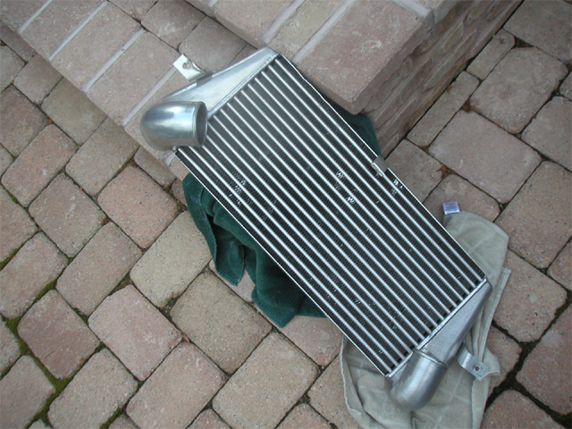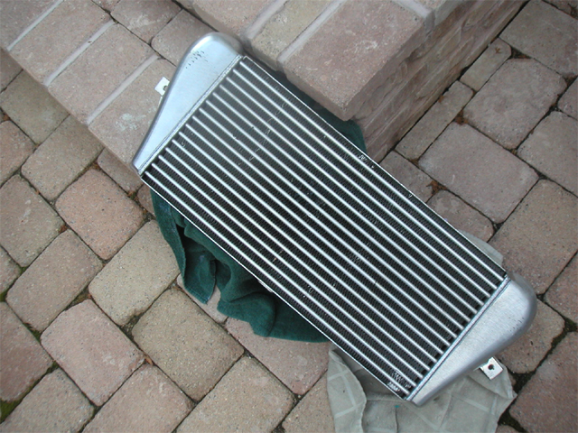 heres the intercooler i didnt know what to use to clean it, styrofoam(wow im a bad speller) was caught up inside so i flushed it with hot soapy water a few times from either side and let it dry in the sun for a few hours its laying next to a dehumidifier right now hopefully that will get all the moisture out