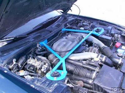 That type of design tends to stiffen up the upper front geometry more than your typical strut tower bar b/c it actually triangulates the whole upper front suspension. The only problem is that the stress on the part that goes to the firewall can cause that area to rip open - at least it did on his car.