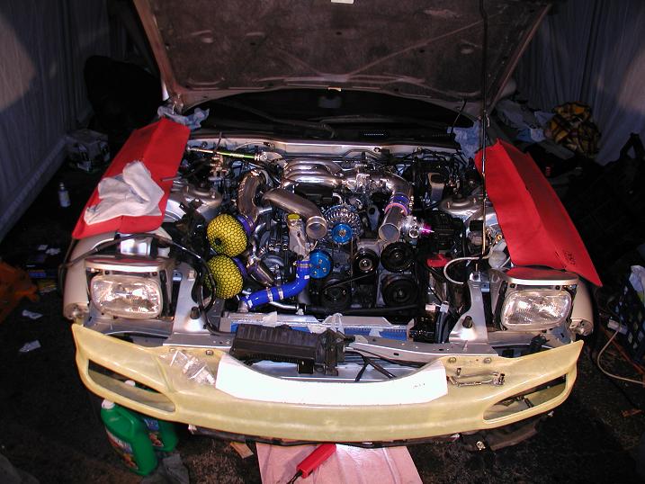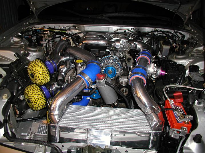 I must say, this has been one of the best projects on my car yet. The total install took about 3 days to complete. This is factoring in work and other things that prevented progress. Everything went in for the most part without problems. A little triming here an there, a few calls to Tom and a few to Chuck as well and the install was complete. If I had to do it again it could probally done in a shorter period of time. Im still waiting for the AST bracket to come in, so I had to zip tie it for now. I have plenty of pictures to post so I will let them do the talking as soon as I can get them up. I had plenty of help from Dave (MakoDhardie) and Charlie (Stokdxiv). As far as performance is concerned. There aren't words for how well this setup worked out. Water temps stayed around 85-100 degrees Celcius and Air temp at cruising speeds is around 30 degrees and in slower traffic is around 45 degrees. I would guess that this temperature will drop a little when the vented hood arrives. The shields should help divert more air to the IC when they arrive as well. Throttle respnse is amazing. In first gear it dosen't seem to want to hold traction if you give it more then half throttle. I haven't really punched it yet. I am waiting untill I get the PFC tuned hopefully this weekend. We installed the Efini Y pipe, HKS J-spec intake, pettit resonated midpipe and Apexi PFC along with the V-mount IC and radiator. I would like to thank Chuck at Rotary Extreme for all of his help and knowledge. Also I would like to thank Jason for his quick response to a problem.