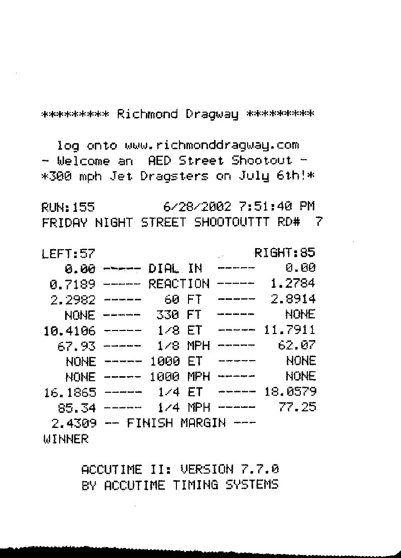 That's not THAT bad for a first time, you do have some good RTs though. If you could pull of a 60' of 2.00 or better...you'd be there. The 1/8th mile needs to come down, but thats just shifting which everybody else mentioned. I was down in Richmond this past friday(the 5th)..should have let me know...I could have ran the car for ya, just to see. Another issue is that your exhaust is stock like you say..your cats are probably not holding up to good...this can result in really bad times...I should know, my NA ran 17.2 w/ a 6.2 RT and clogged cats...put straight pipe on and got a 16.5 w/ 6.4 RT...I would go with a highflow cat and catback right now, that'll at least get you to the 15s...