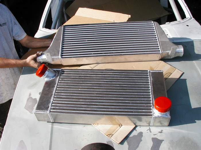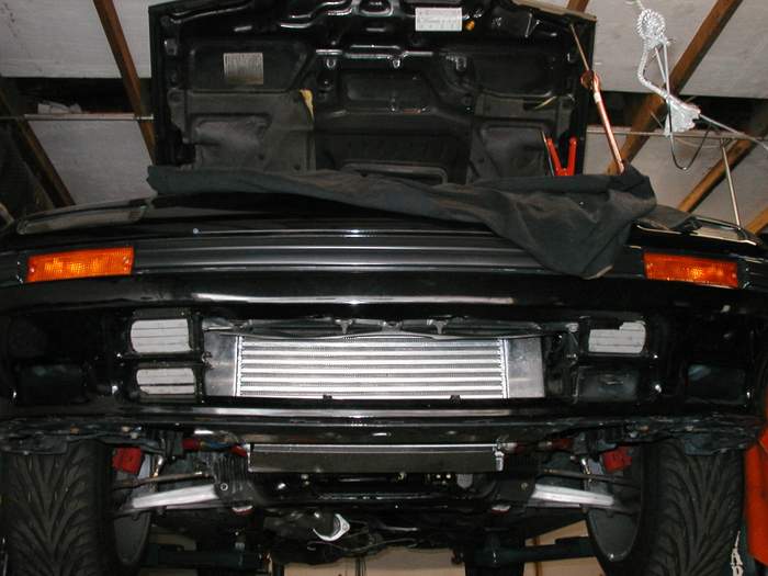 Here is the intercooler I had custom made. I have toyed around with making a Jims5543 intercooler kit. It was made by Turbonetics/Spearco. It fits perfectly between the side rails of the car. I used the Greddy kits piping for this intercooler and I had 5 feet left over!!