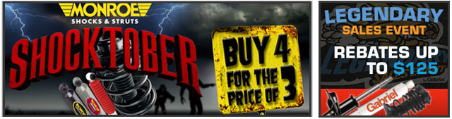 Monroe is again offering their "Shocktober, Buy 4 for the Price of 3" promotion on shocks and struts, but you do not have to wait for October. Take advantage of Monroe's Shocktober and Gabriel's "Legendary Sales Event" right now at RockAuto. Look up your specific car or truck in the RockAuto online catalog and watch for the rebate/promotion star icons (