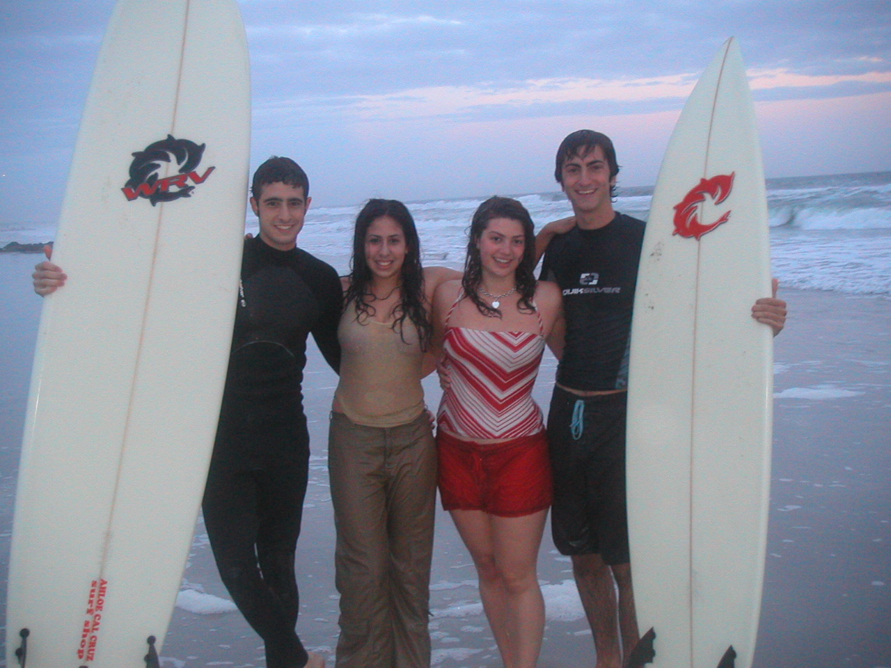 my friend scott our respective sisters (who made us take them to the beach) and me on the right with my new baby, a 7'0" WRV big boy short board. more wobbly and unstable than the 7'8" fun board i learned on but im getting used to it