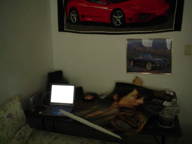 My sister just got home from school and gave me this huge scroll. I unrolled it and it was a big *** movie poster for The Return Of The King. LOTR rules, here's the pic of it, my Modena Towel, and the 61 Dual Quad Vette. Woo woo.