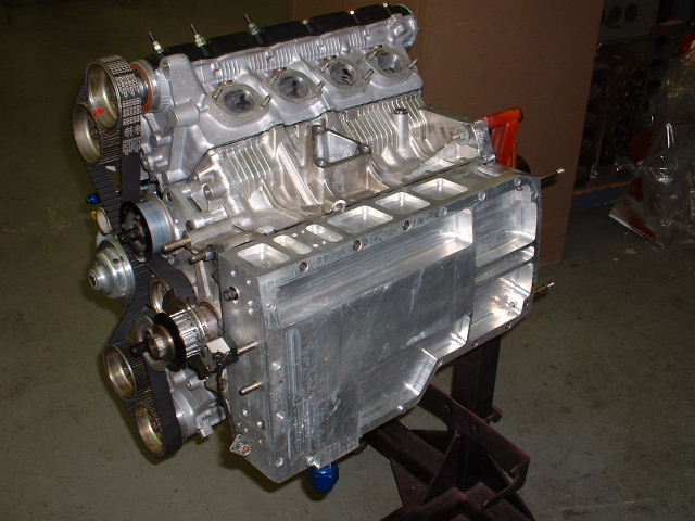 Here's one of our crowing achievements, a Billet oil pan for this 348. It needed it because the car that it is in uses the motor as a stressed member, and the standard oil pan wasn't up to par.