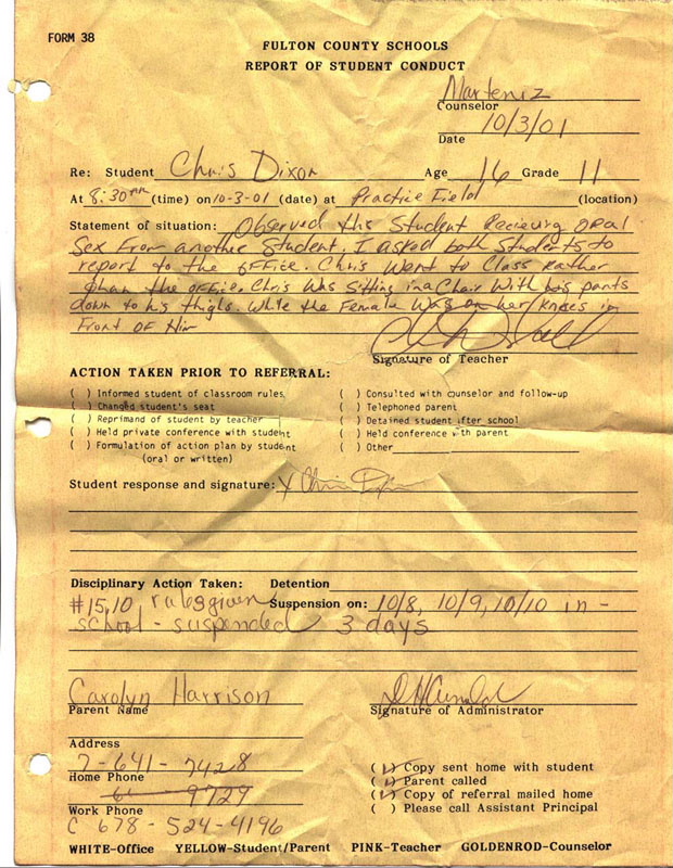 Fourth a 3-day in-school suspension? Try instant expulsion for any sexual acts, or at least a much longer out-of-school suspension considering he's only 16 which means he and/or the chick probably aren't "legal".