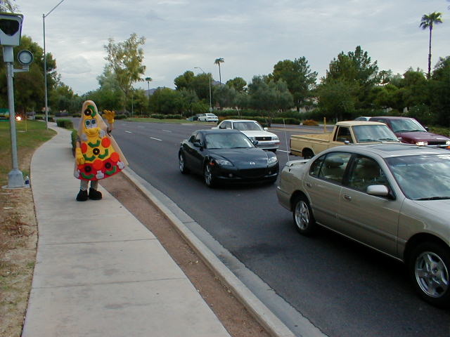my district manager at papa johns thought itd be cool to put on the pizza suit and go stand out on the street, well i had to hold the sign, and had my digicam on me, and took a picture of him next to an rx-8, lol