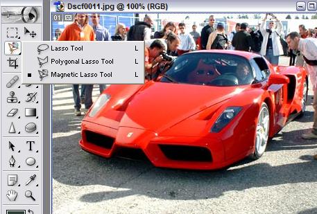 I attatched a picture to help you find it. Use it to select the body of the car. What it does is: as you drag the lasso along the body lines of the car (Even the wheel well!) it "Senses" the edge of the object (Using Super-poly-grapho-morphic-telo-tropography....but that's for another lecture).