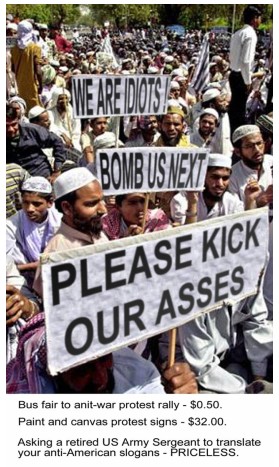 I had this sent to me right after the war started in Iraq, it was a Pakistani anti-war demonstration, and they had the signs out for about an hour until somebody translated it right for them according to the e-mail I received on it. Still pretty funny.