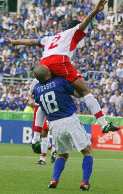 blue defending a lofted kick from corner, other guy was in front of him, jumped amazingly high and in a rearward direction to redirect the ball with his head towards the goalie.