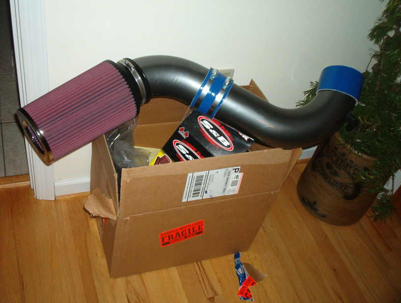 Figured I'd throw up a pic of the intake my father had orderd for his '03 Hemi Ram. They look a lot like the intakes we make..just bigger,lol. It was bitch to install though as the materials the company used were a very tight fit(too tight) and we had 6" of snow on the ground and the truck doesn't fit in the garage! Anyways...the intake turned out good and matches the truck perfectly..the actual product was good, just needs some small changes.