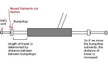 As far as I can tell, the spacers move each of the inner bumpstops outwards on the rack itself. Thus, instead of the rack being able to give one foot of travel between hitting each side's bumpstop, it can now travel 12.5". Thnik of adding a shorter bumpstop onto the stock shock absorbers... the ride height would still be the same, it would just be able to move up that much farther before it bottomed out.