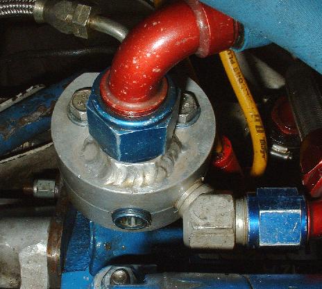This is the plate that replaces the oil filter adapter and provides a dash 12 oil pressure in from the pump and filters. A dash 4 to the oil pressure gage. Unseen on the other side is a sender for oil temp. and the hydraulic 45 fitting is the dash 10 line to the front lateral gallery.