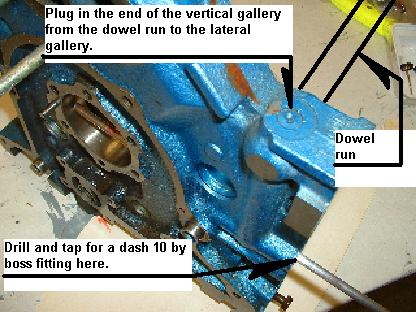 This gives you two paths for oil to the front main bearing. Not only are there threads in the dowel run from the rear gallery, there are a number of razor sharp 90 degree turns that reduce oil pressure.