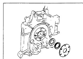 This picture shows the front cover and front iron completely disassembled yet the bolts holding the front gear are still on. In the middle of the gear, there's a white ring -- this white ring is the bearing that's pressed into the gear. The gear and its bearing remain stationary while the crankshaft (centre of the bearing) rotates in and rides inside of that bearing via a bearing race.