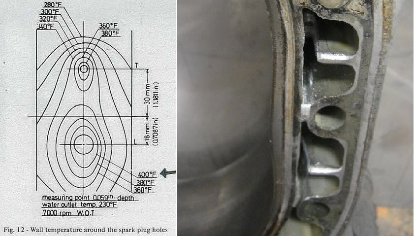 Mazda found the combustion burn-rate could be improved by widening the distance between the leading and trailing plugs. In order to do this as economically as possible they kept the through-bolt locations in the same place so they could use the existing side plates. This in turn decreases the size of probably the most important water passage in the engine!