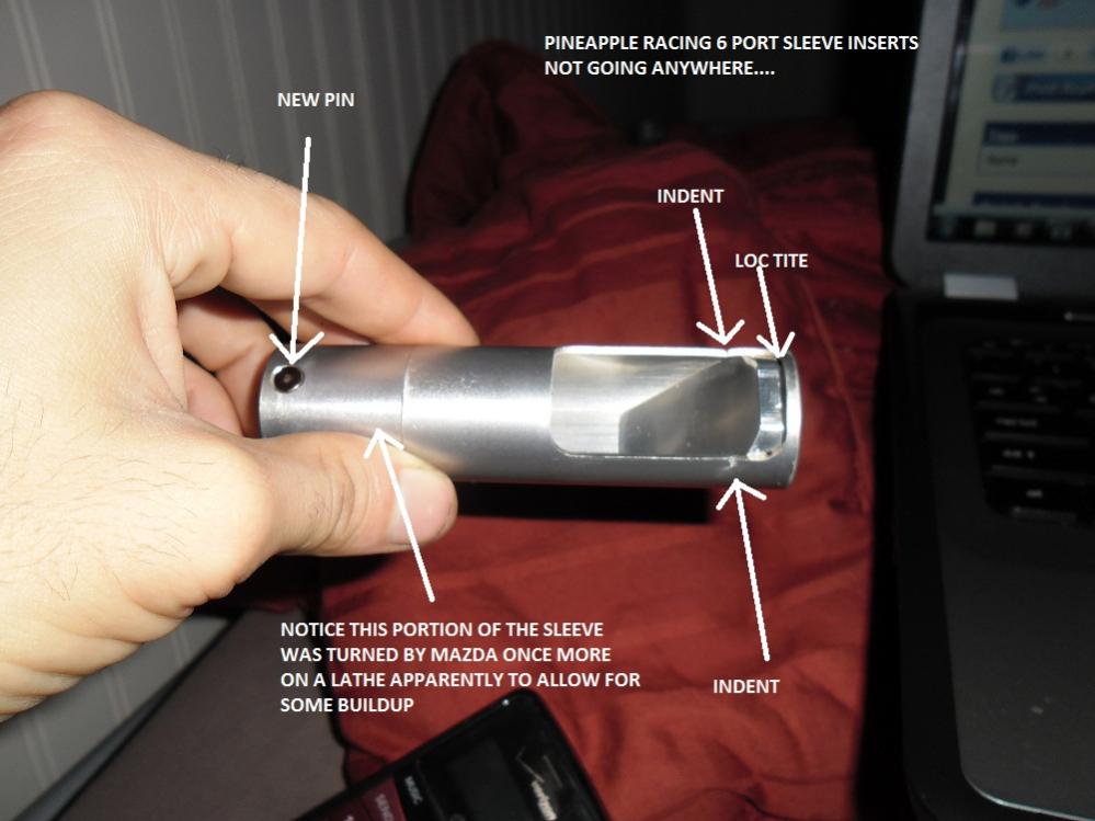 I was gonna order the atkins sleeves online but noticed the atkins looked slightly different from the mazda factory sleeves, so I went over to pineapple racing and picked up his six port sleeve inserts. I recommend them over the atkins sleeves because the thing i noticed was the factory sleeves have been turned on a lathe once more near the rod part, seems like to allow for some buildup and still be able to turn well. the atkins sleeves do not have this portion. Also the pineapple inserts are only 39 dollars and come with new pins. For those of you worried if the sleeves are going to fall out and break your keg, it ain't happening. First of all as you can see in the pic ( look how shiny i cleaned them! ) there are two points where you take a peen hammer and screwdriver and make indents just in front of the insert to keep the insert from ever moving in the unlikely event that the 'loc tite' doesn't, well.... lock tightly. Also even if you didn't peen it i highly doubt that little piece of aluminum is going to come crashing through and break the pin lol, not going to happen.
