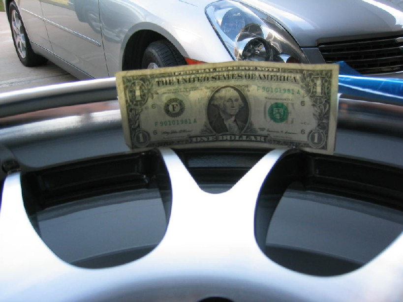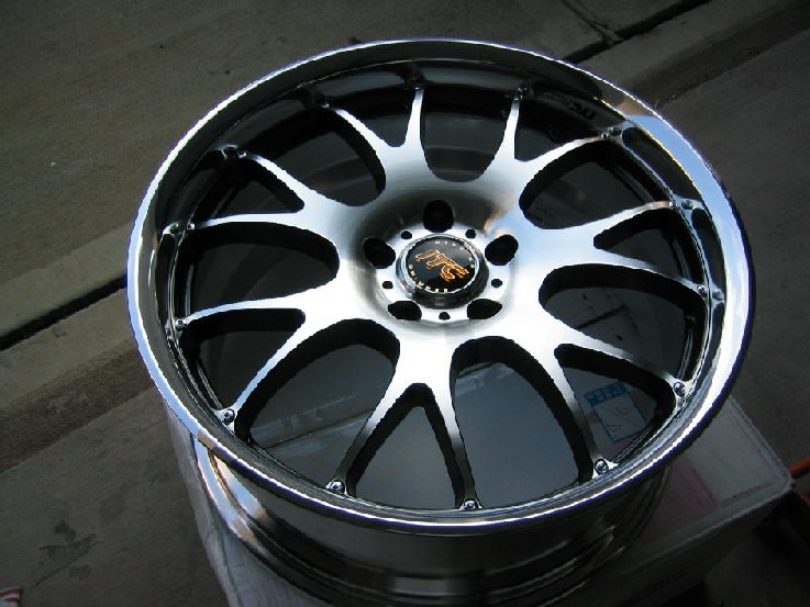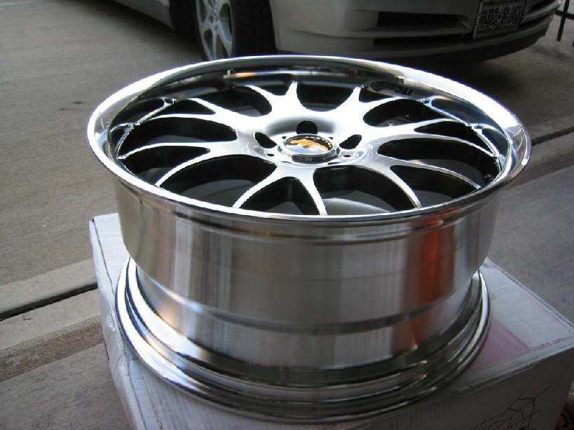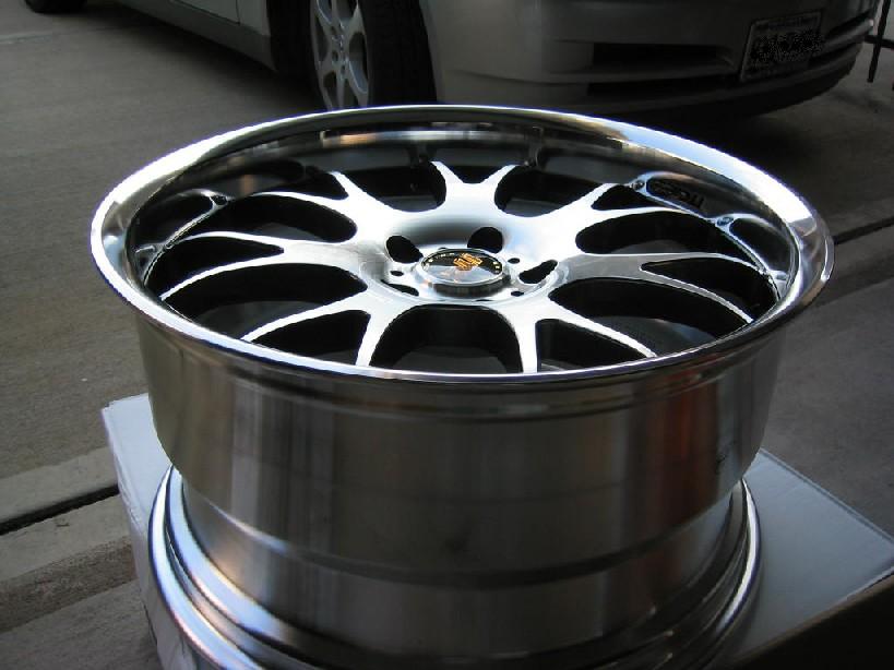 Nice lip in the rear, polished lip. Wheels are a two piece design, but with with wheel bolts. Face is a natural machined finish with a clear coat, sides of spokes are gunmetal. Neat finish. Weighs in the low 20's, bathroom scale. Will see about getting a more accurate measurement. Never the less, definitely on the lighter side for 19"s - as to be expected from Rays Wheels.