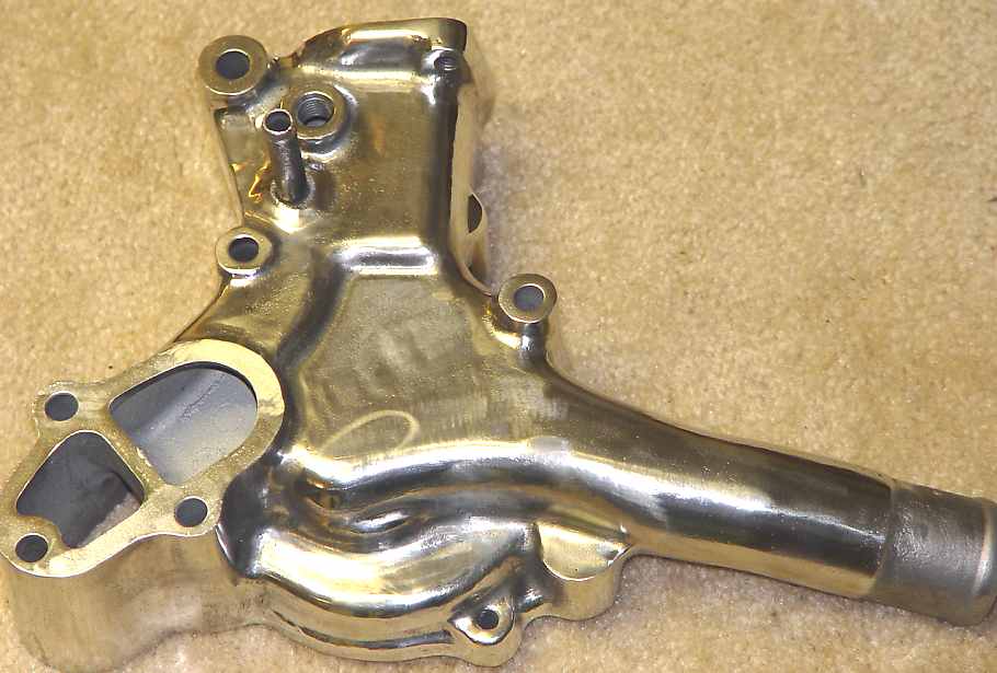 One S4 water pump housing that has had the following work done to it by myself: Aluminum oxide blast followed by glass bead blasting, 25 hours of tumble time with different grades of tumbling media, and finally sanded and buffed out to the polish you see in the pictures.