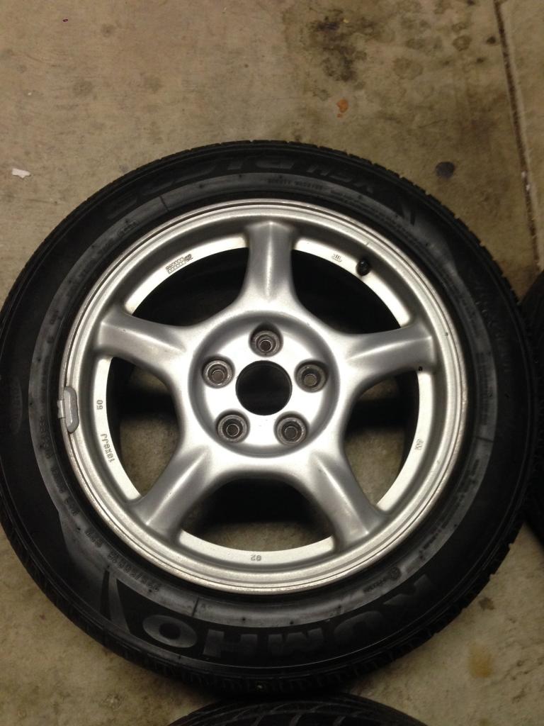 I have a set of OEM 16x8 wheels/tires from a 1993 Mazda RX-7 for sale. Wheels are in good condition with minimal curb rash. Two tires are Kuhmo Ecsta ASX, two tires are Dunlop SP 8000. Tires are in decent condition and can be driven on no problem but will need to be replaced eventually. One wheel is missing a center cap.