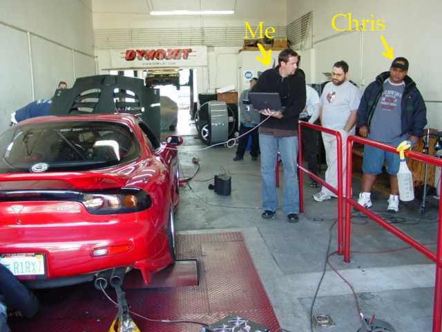 Let's take another look at that "tuning" picture. I've labeled Chris and myself. Chris "should" have been the one doing the tuning. I've known him by reputation and the internet for some time, years actually. Never met him in person and I didn't know that was him. He has an FC which runs low 9's (he can give you the exact times/trap speeds) but he's a tuning/rotary god. Dude, next event, you're our featured speaker :-)