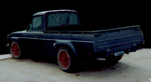 Well.. I was playin in Photoshop with an old pic of my truck.. it is a lil rough but I like the look.. it has that old 50-60's style rod look to it.. I like it.. what you guys think.. Black satin finish, with red steelies.. (which I can get made out here in any size/offset), and whitewalls.